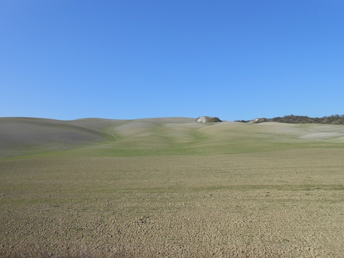 El primer tramo circulo por una toscana forestal. Atravieso una serie de bosques y paulatinamente el paisaje empieza a tornarse suave, de colinas brillantes y sedosas. Ah, esto es lo que venía buscando. Ahora una villa en lo alto de una colina circundada de pastos, tierras fértiles roturadas, viñedos, cipreses,…en una conjunción cromática que emocionaba. Es difícil de describir, como digo. El día además ha sido otoñal soleado, destacando las tonalidades pálidas. Una sonrisa se me dibujaba en el interior del casco, del que prescindía en ocasiones, por ser modular, para respirar ese aire tan puro y fresco aún a riesgo de toparme con algún insecto.