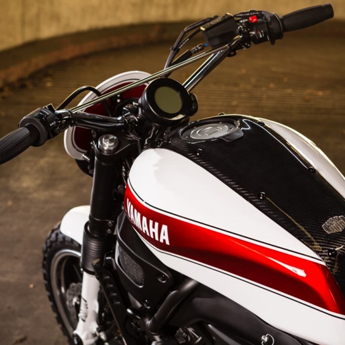 Los responsables de esta Yamaha TY700R son los franceses de Liberty Yam –http://www.liberty-yam.com/– que hacen esta propuesta, que parece una scrambler siglo XXI, hipervitaminada. Como en todas las propuestas más radicales, habrá opiniones para todos los gustos, pero personalmente me parece un muy aceptable resultado: escape elevado firmado por Yoshimura, pequeña cúpula portanúmeros, barra de refuerzo en manillar elevado, faro modificado y espectaculares neumáticos -tipo donut- Continental TKC80, 120/70-17 delante y 180/55-17 atrás, así como un sinfín de pequeños detalles que hacen un conjunto muy logrado. La combinación en blanco y rojo, una pasada.